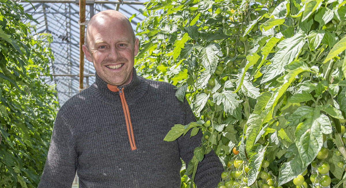 Drivhussnadder: Cherrytomatane er i rute, konstaterer Tom-Arild Smith-Jacobsen Bekkeheien. Produksjonen er energikrevjande. Naturgass/propan må til i tillegg til vind- og solkraft.