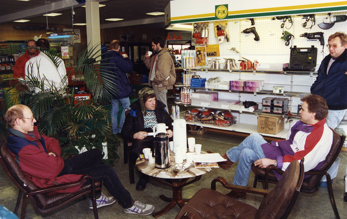Pause: Ein god drøs høyrer gjerne med der bønder samlast. Her frå det som då heitte Fk-Butikken på Varhaug, ein gong på 1990 talet. Dei tre rundt bordet er frå venstre: Anton Tjemsland, Jarle Ånestad og Leif Arne Skretting. Bak Leif Arne står Mons Skrettingland. Fotografiet er i BondeKompaniet Varhaug sitt eige.