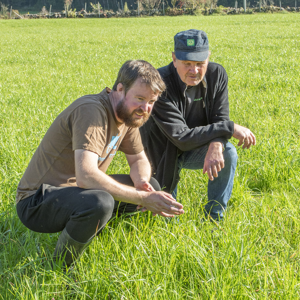 Grasblikk: Bonde Øyvind Steinnes og grasveteran Ragnvald Gramstad er begge opptekne av verdiskaping gjennom å dyrke eng som gir smakleg fôr med høg kvalitet. Øyvind forlenger enga si levetid og tyner kveka med å så i eitt- og toårig raigras saman med kløver.
