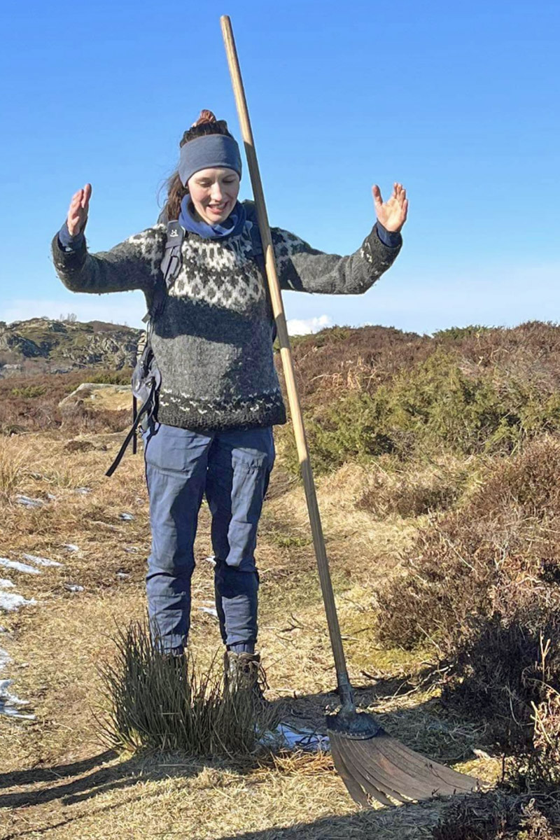 Tett på lyngen: Siri Vatsø Haugum ved Lyngheisenteret på Lygra har studert jorda under lyngheia og funne ut at den lagrar meir karbon enn jord under bjørke- eller furuskog. Her er ho utstyrt med ein brannpisk som brukast til slukking av lyngbrann. Foto: Vibeke Døsvig