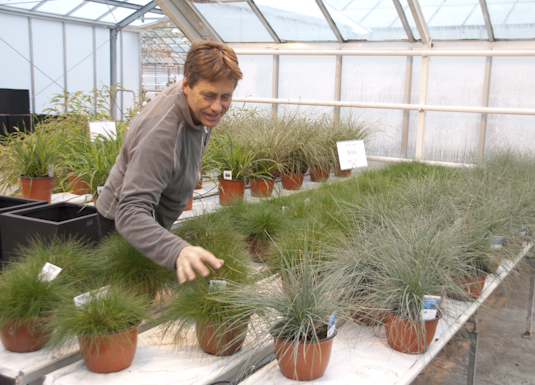 Endre Selvåg viser fram litt av sortimentet av prydgras.