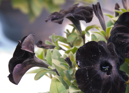 Blomster med særprega farger er på moten. Her en petunia i rødsvart.