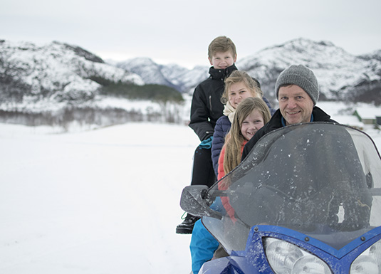 Han sit på skooteren saman med dei tre barnebarna. Lite kan måle seg med å køyre snøskooter med morfar.