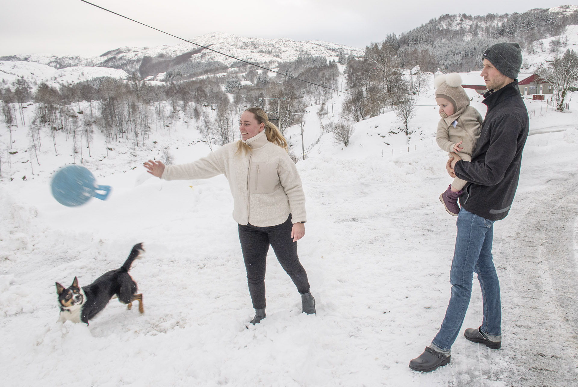 Alt i spel: Morsfolket til Geir Aasmund Dybing har vore på garden i heia over Helleland i over 400 år. Nå kan det gå mot slutten for historia deira her. Geir Aasmund her saman med Julie Dybing og dottera deira Judith. Hunden Tass i full fart etter ballen.