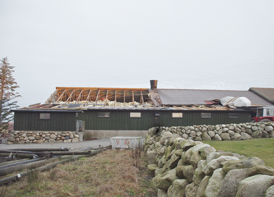 Det var ikkje berre grisehuset til Joveig og Jo som fekk smaka på nordavinden. Garasjen, som står like ved grisehuset, fekk seg ein smell frå ei takplate som løsna, leikehytta velta overende, og vindauget i verandadøra knuste.
