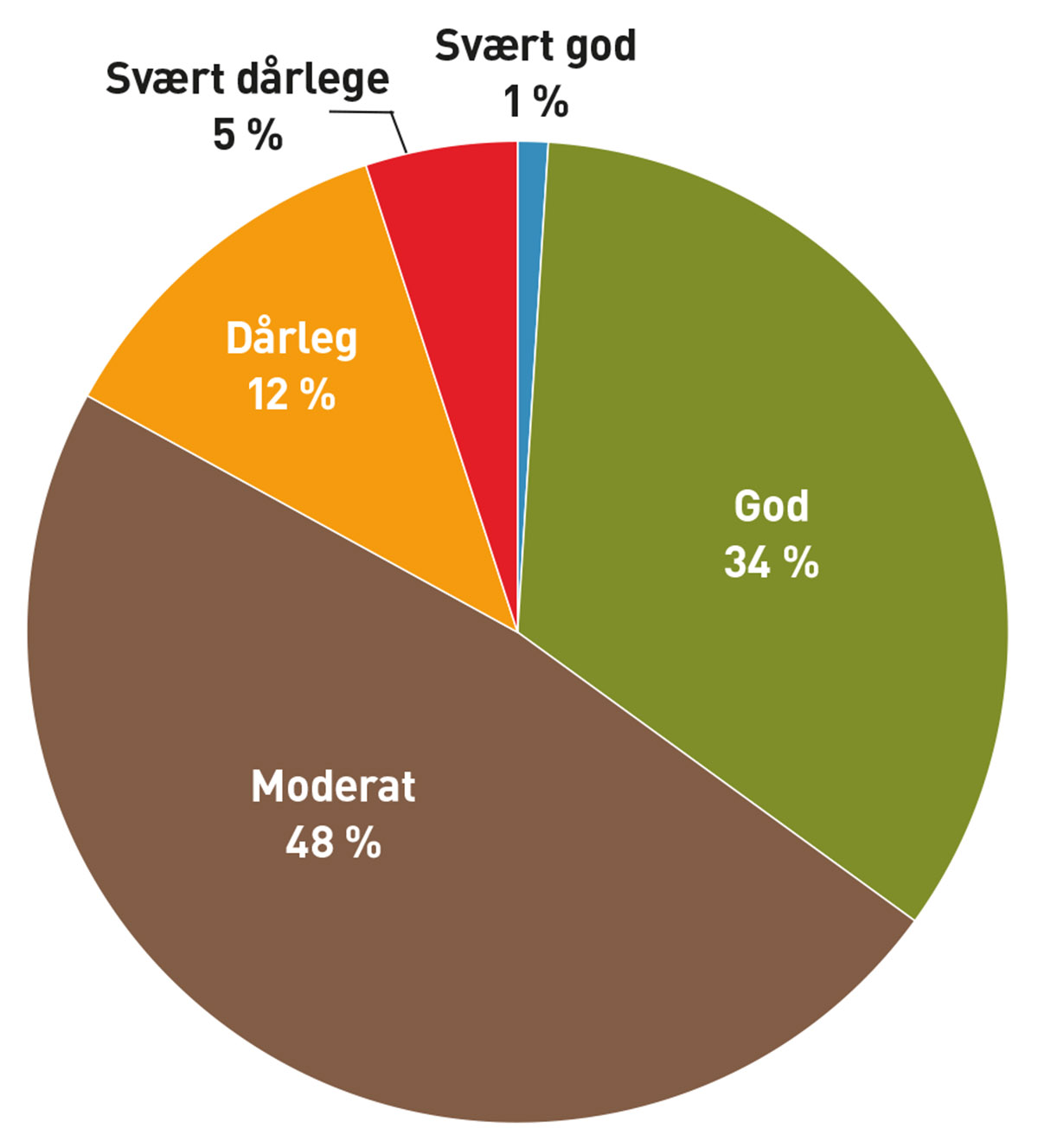 Ikkje i mål: Prosentfordeling av økologisk tilstand i elvar og innsjøar som er påverka av jordbruk i dei åtte fastlandskommunane i Jæren vannområde. Utvalet består av 206 unike vassdrags-ID. Ingen elvar og innsjøar her manglar klassifisering av økologisk tilstand. Diagrammet er basert på datasett henta frå Vann-nett.no 3. november i år.