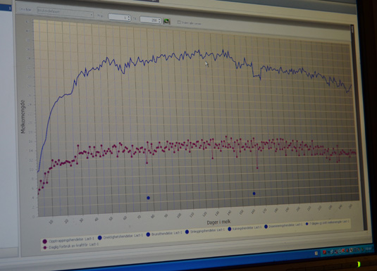 Roboten viser at mjølkemengda er 37 liter per ku og dag, med gjennomsnitt 141 laktasjonsdagar.