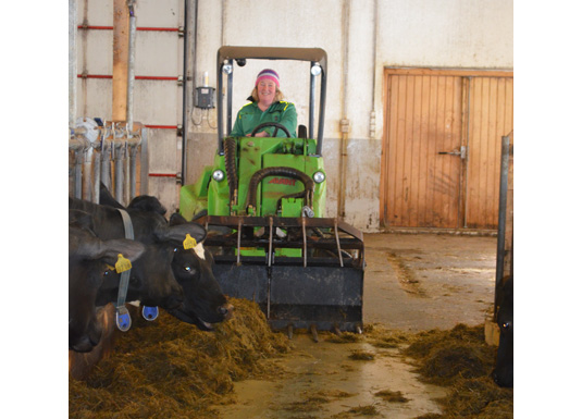 No nyttar dei minilastar til å fordela fôret ut på fôrbrettet. Eit godt hjelpemiddel som kjem til både på fôrgangen og i gangarealet i lausdrifta. Men dei legg til at fullfôrblandar står på ønskelista.