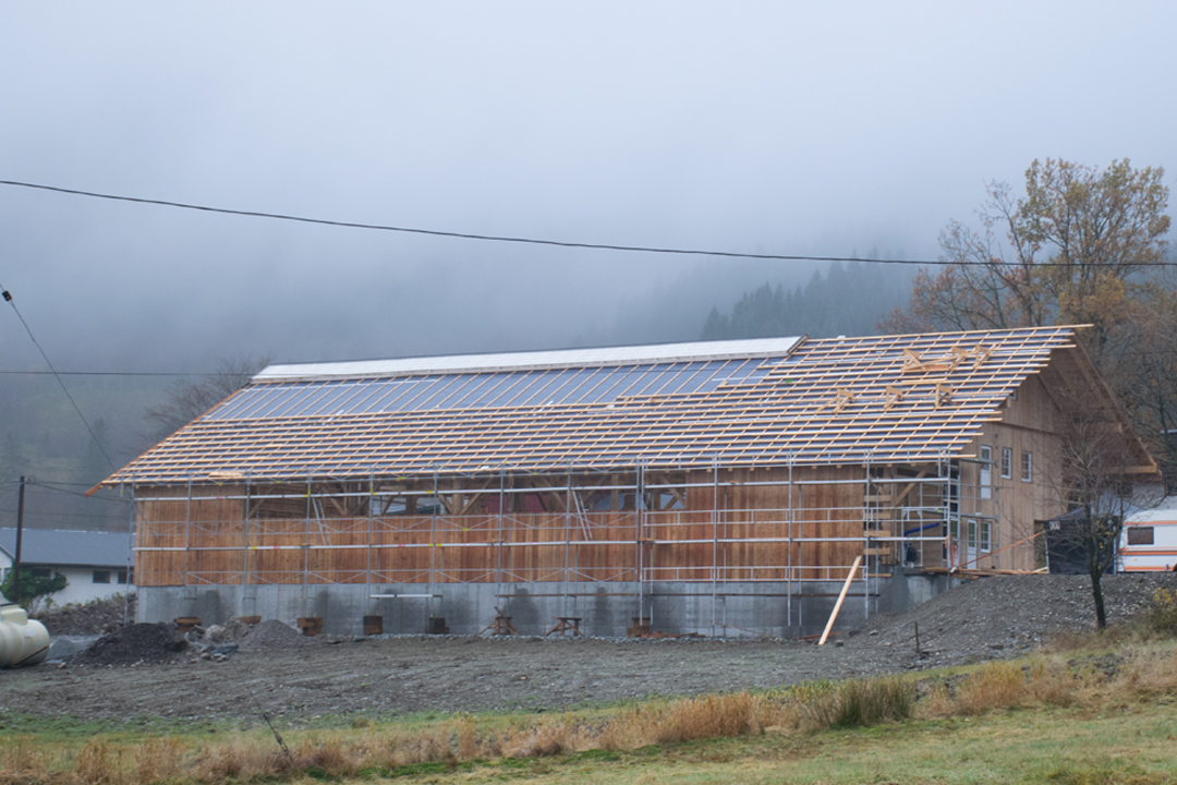 Og det er ikkje til å ta feil av. Ikkje fordi det er stort og påkosta. Meir fordi det er i tre, det er majestetisk, men passar godt inn i landskapet, og det er eit av få nye driftsbygningar her i Langedalen nord i Bergen kommune. Fjøset er ikkje heilt klart, men dyra har flytta inn. Kjellaren er betong med spalt, medan innreiinga er i tre og overbygget er eit tradisjonelt grindverksbygg.
