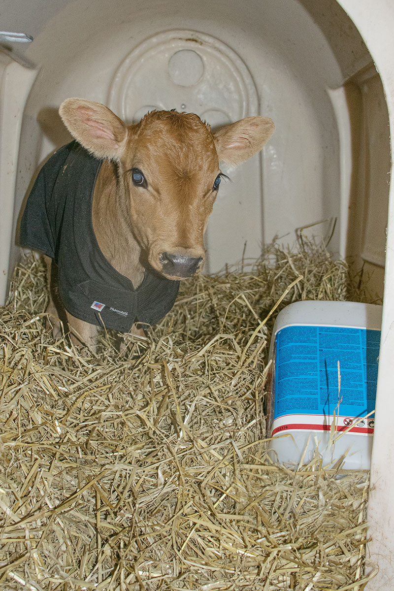 Har du kalvane ute i kalvehytter, fyll to 25 liters kanner med heilt varmt vatn og sett dei inn i halmen i hytta til den nyfødde kalven. I tillegg kan du nytte ei plate som dekker for opninga, mest heilt opp, slik at varmen held seg inne i hytta.