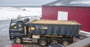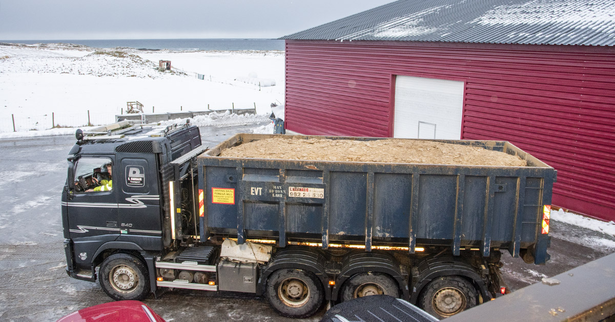 Råvarer: Lastebil på veg til fabrikken med tjue kubikkmeter hønegjødsel i containeren.