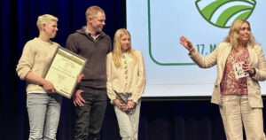 Prisa for pågangsmot: Stina og Øystein Fosen, her med eine barnet, Ida, får årets heiderspris for landbruket i Rogaland. Prisen vart delt ut av landbruksdirektør Monica Dahlmo.