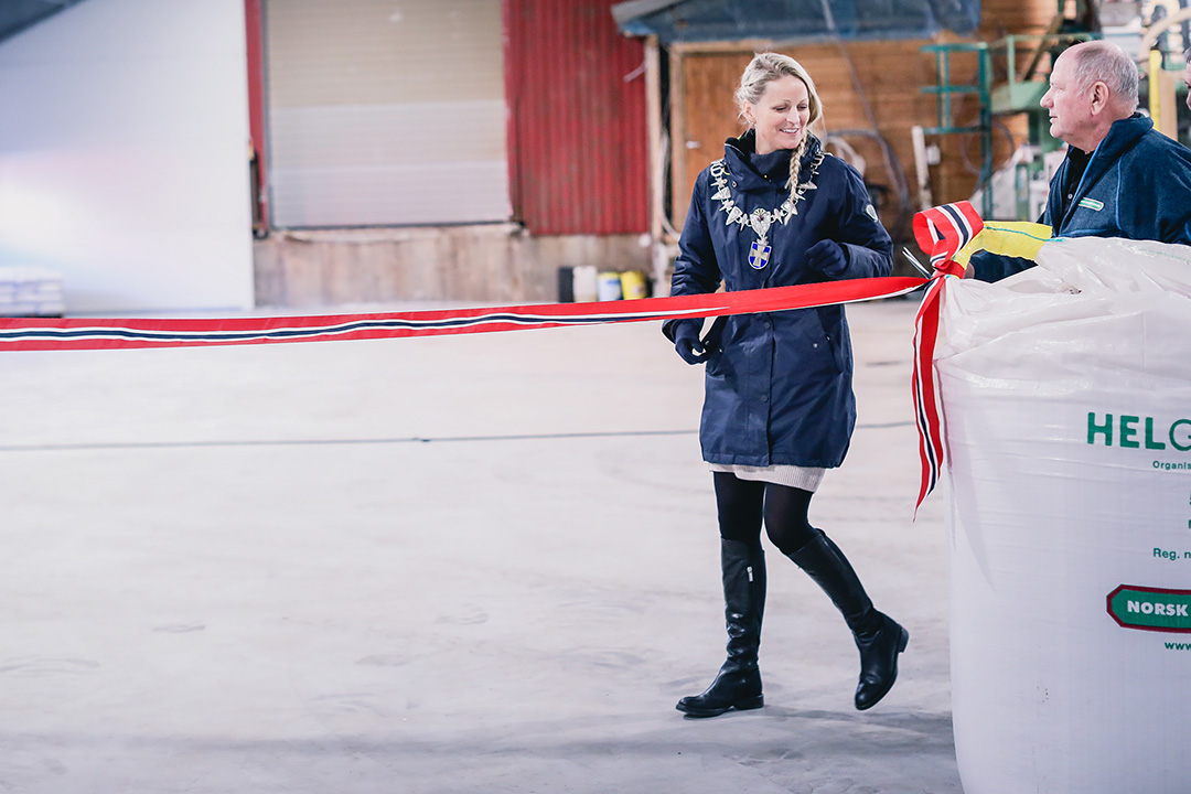 Snorklipping: Daglig leder Ole Gunnar Fuglestad, følger med når ordføreren i Klepp kommune, Ane Mari Braut Nese gjør seg klar til å klippe snora som markerer åpningen av Norsk Naturgjødsel sin nye produksjonshall. Foto: May-Linda Schjølberg.