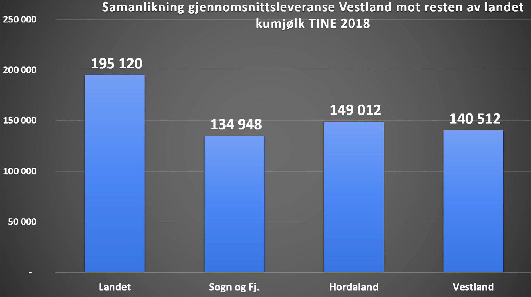 Gjennomsnittskvoten i Hordaland er 149.000 liter, uavhengig av driftsform. I Sogn og Fjordane er talet 134.000 liter. I sum har mjølkebøndene i nye Vestland fylke kring 180 millionar liter i kvote. Av 1198 hentepunkt er 318 lausdriftsfjøs og 205 av desse har mjølkerobot. Volumet er jamt fordelt mellom båsfjøs og lausdriftsfjøs. Gjennomsnittskvoten i båsfjøsa er på 97.000 liter.