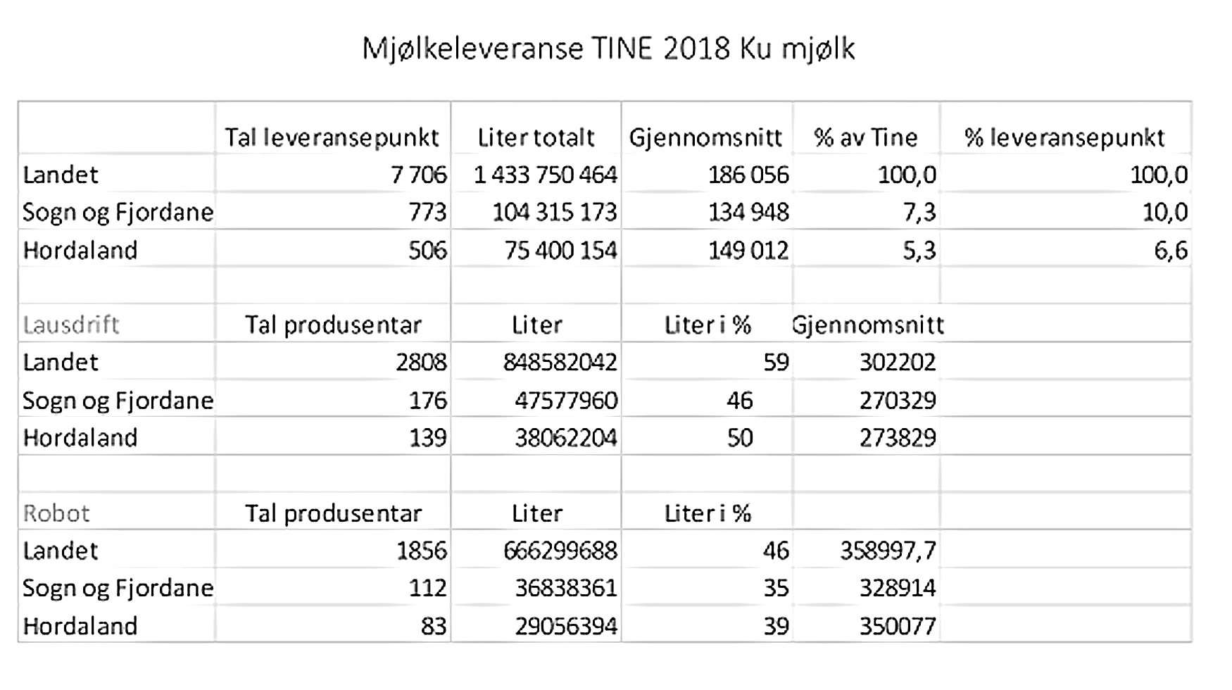 Tabellen viser tal på fjøs totalt, med lausdrift og med mjølkerobot i landet og i dei to fylka som blir Vestland fylke frå 2020. Vidare viser tabellen fordeling av liter mjølk mellom dei ulike fjøstypane, samt prosentvis del av mjølka og gjennomsnittskvotar i dei ulike fjøstypane.