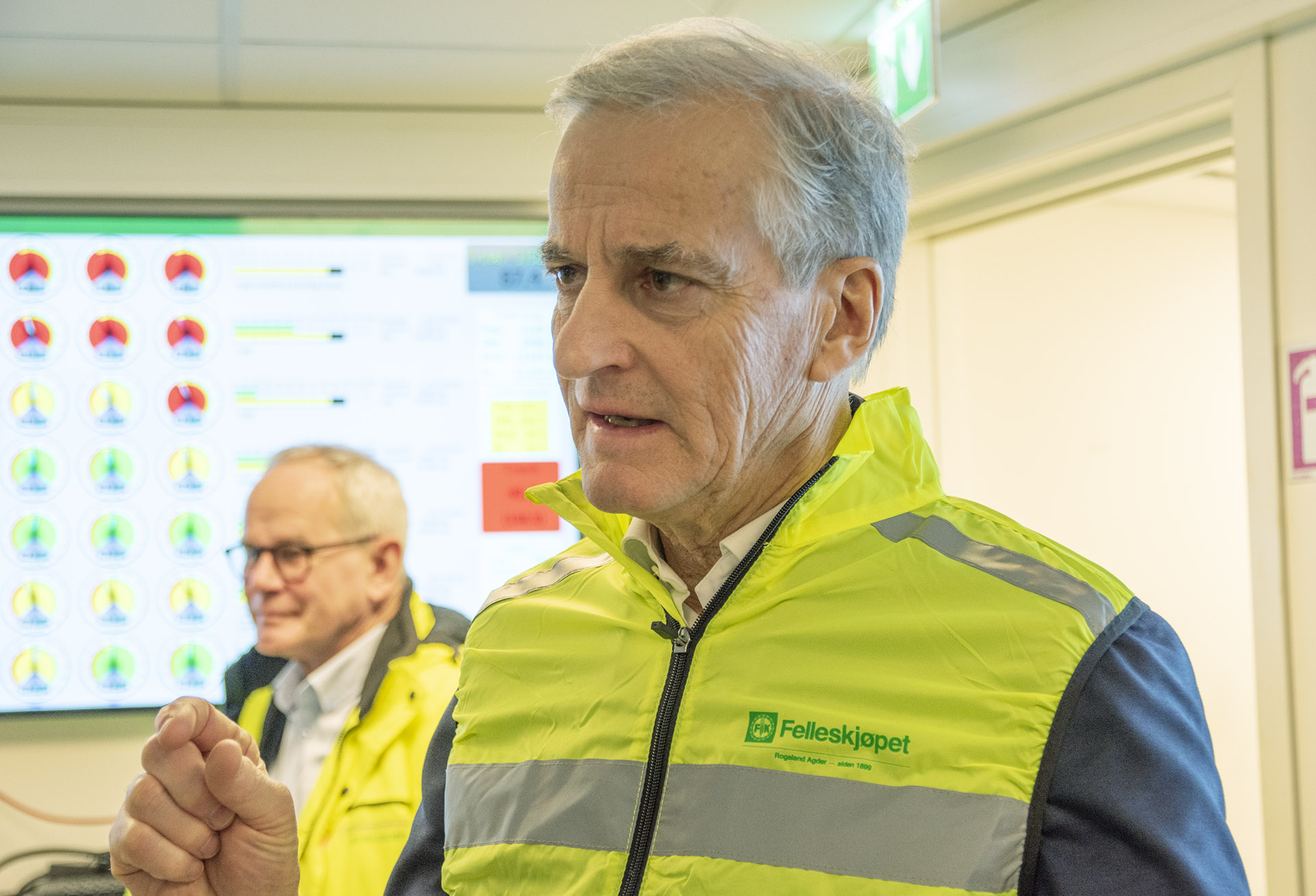 Alvor nå: Frå kontrollrommet til FKRA sin kraftfôrfabrikk i Stavanger overvakar ein produksjonen som 20 prosent av Noregs husdyr er avhengige av. Samvirket si rolle for matberedskapen var ikkje tapt hjå statsminister Jonas Gahr Støre, som kom på besøk berre dagar etter å ha lagt fram regjeringas totalberedskapsmelding. Administrerande direktør i FKRA Per Harald Vabø i bakgrunnen.