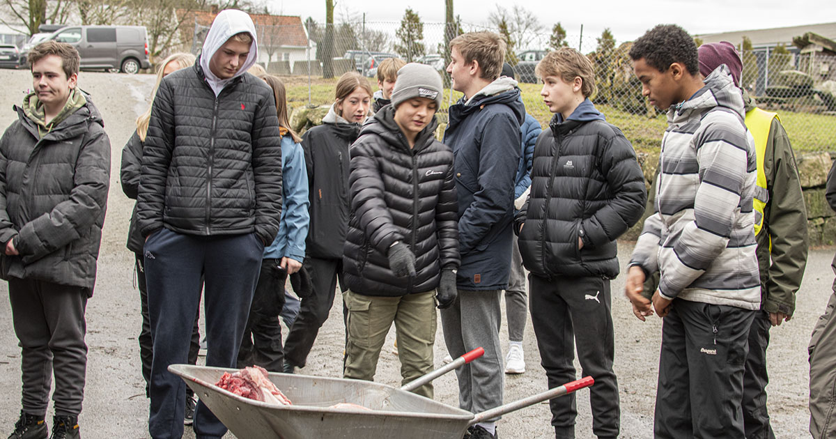 Griseslakt: Same dagen som elevane frå Goa skule var på besøk, måtte ein gris i skulefjøset slaktast. Elevane fekk studera kjøtstykka.