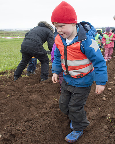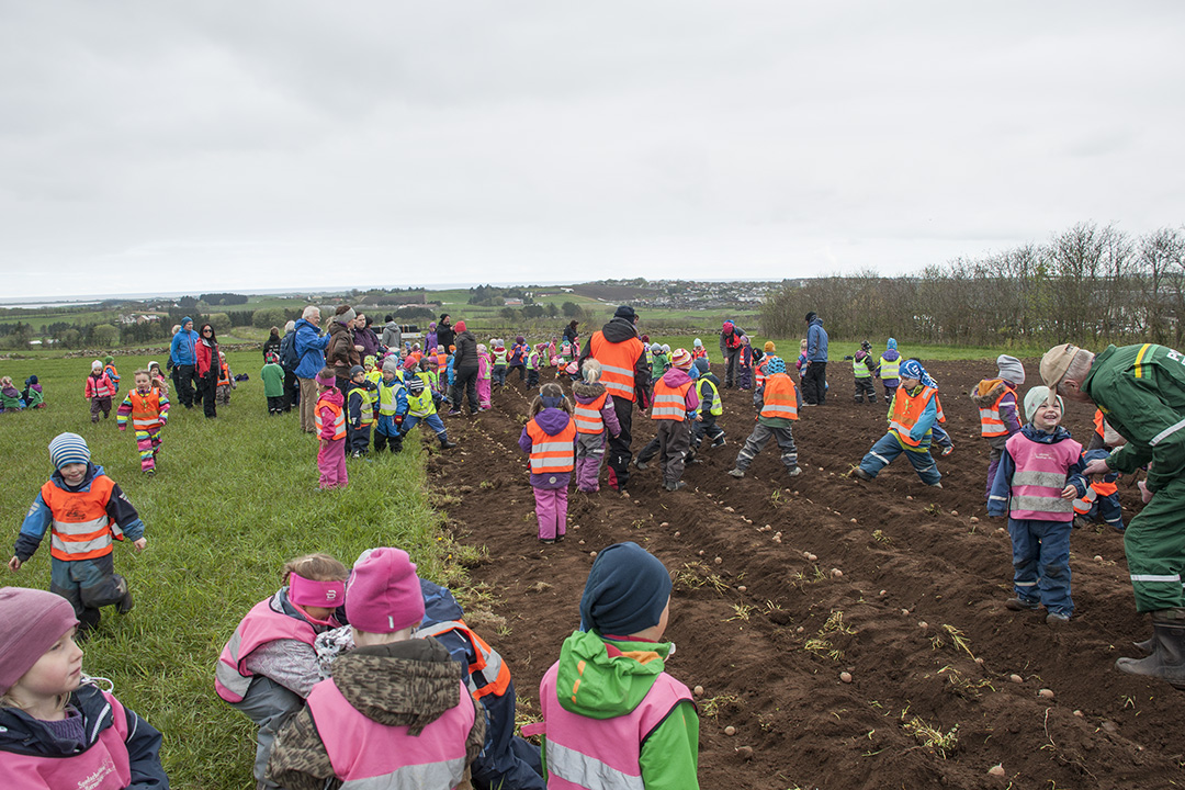 Ungane frå Tu Barnehage i Klepp kommune vrimlar frå kassen med settepoteter bort til fòrene. Dei følgde nøye med då dei fekk instruks; ikkje trø på potetene, ein fot mellom kvar potet. Med hjelp av dei vaksne, går dette ganske godt. Etter arbeidsøkta er det ekstra godt med matpakke.