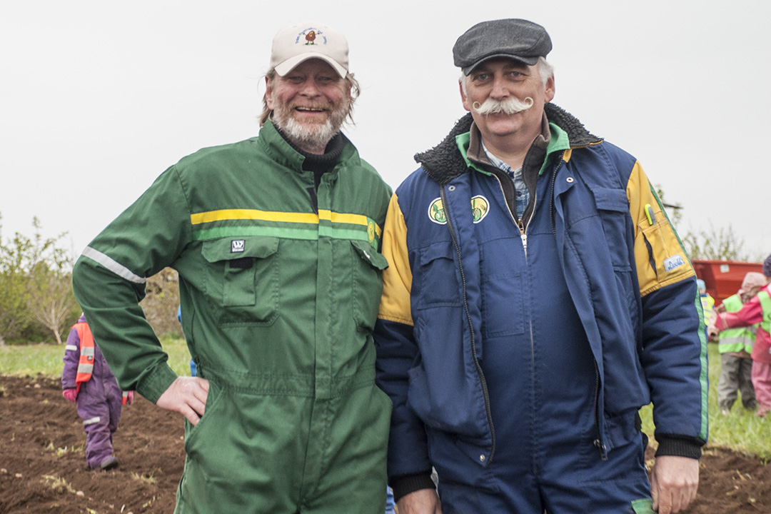 19. gong: Det er på ingen måte første gongen potetfestivalgeneral Christian Stabel (t.v) og NLR-rådgjevar Arne Vagle tek i mot hundrevis at potetklare barn på potetjordet. Det er 19. gong dei får hjelp av lokale barnehagebarn.