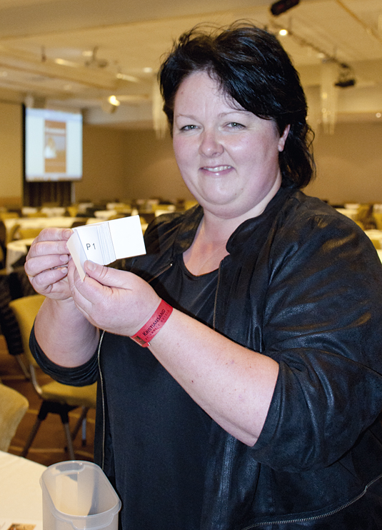 Birte Usland meiner det er sjølvsagt å vere med på Sørlandssamlinga. Her viser ho ei utseld loddbok. Inntektene gjekk til Bondelagets prosjekt i Malawi.