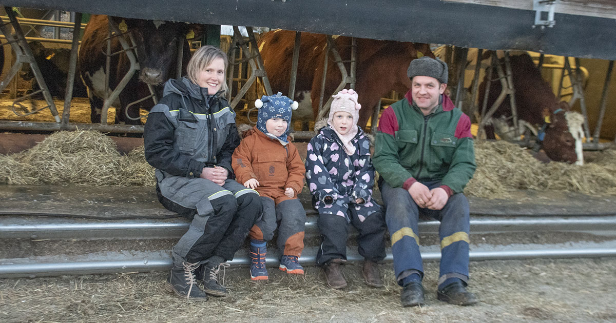 For framtida: Framtidige generasjonar skal også ha jord til å produsera mat. Egil Byberg og Arnhild Erevik har bygd mjølkefjøset på ei fjelltomt på garden. – Ved å plassera fjøset her, tok me ikkje matjord i det heile tatt, seier Byberg. Synnøve (6) og Arild (3) skapar liv og røre på garden.