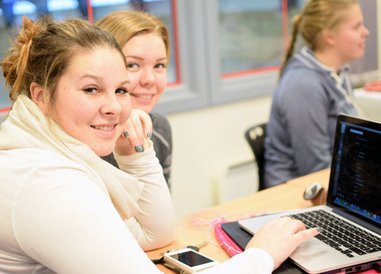 (F.v.) Elisabeth Vikan Hoem (17), Isa Marie Evensen Jonassen (17) og Hanna Rodal (17) lager klar speleliste med julemusikk, sjølvsagt.
