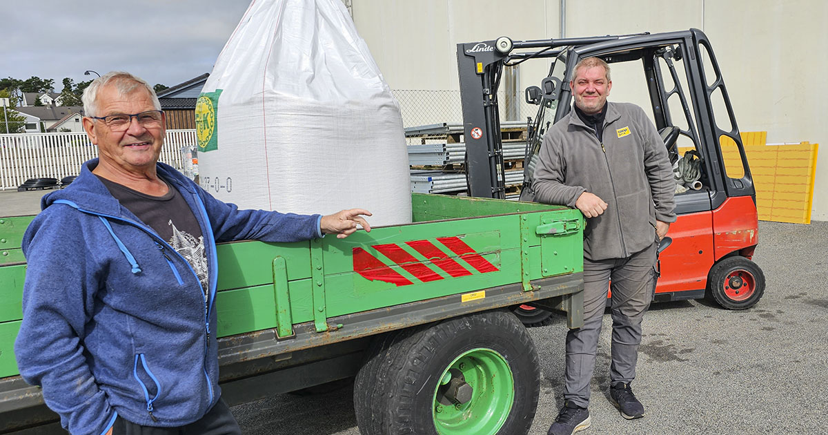 Kjøper haustgjødsel: Mykje tyder på at gjødselprisane aukar utover hausten og vinteren. Så blir det opp til bonden sjølv å avgjera kjøpetidspunktet. Her har Vidar Undheim t.v. sikra seg ein sekk med CAN 27 som han skal friska sauebeita med. Til høgre står Karl Dag Bore frå Undheim Handelslag.