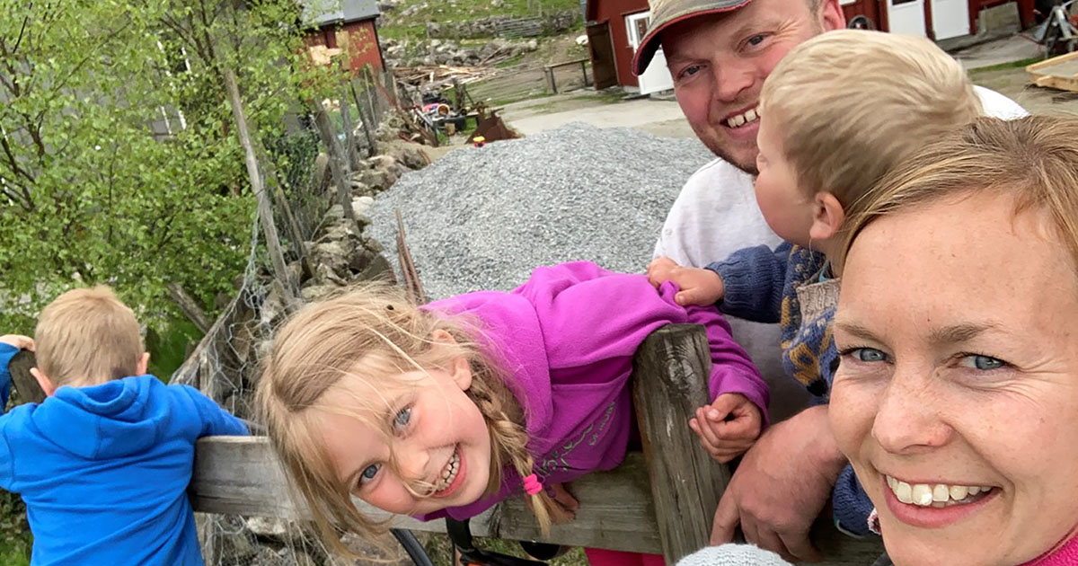 Familien Hustoft: Frå venstre: Aksel, Solveig, Ståle, Lars og Åsne med Selma i bereselen. Åsne og Ståle er opptekne av å gi barna positive opplevingar i kvardagen sjølv om bondelivet av og til kan vera krevjande for dei vaksne. Privat foto.