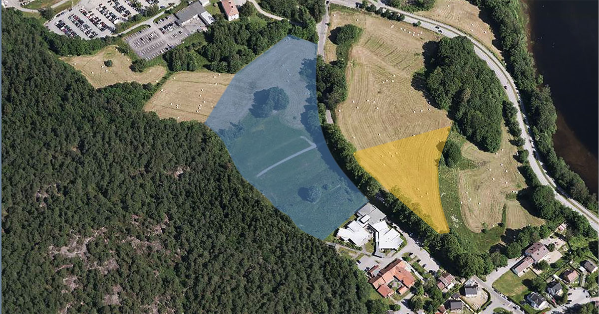 Fare for færre rundballar: Der rundballane ligg strødd, har grunneigar andre planar. Jordet på Eg som bonde Magne Thorvald Bakken kjempar for er 16 dekar. Seks dekar matjord vil gå dersom planane om eit barnehospice blir realisert (markert med gult). Til høgre for markeringa er eit jorde på kring åtte dekar. I området med blå markering blir det bygd ein ny sjukehusavdeling. Dette området er over 20 dekar, og vart omregulert i 2016. Foto: Blom Norway