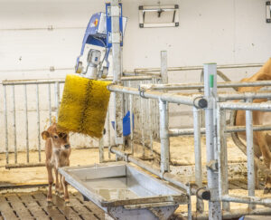Ku/kalv: Å byggja for ku/kalv-samvær krev såkalla kalvegøymer der kalven får ligga i fred for dei større dyra. I tillegg krev det nokre fleire grinder som hindrar dei små kalvane å finna smutthol og gå der dei ikkje skal gå. Denne kalven har funne ut korleis han skal handtera kløkosten.