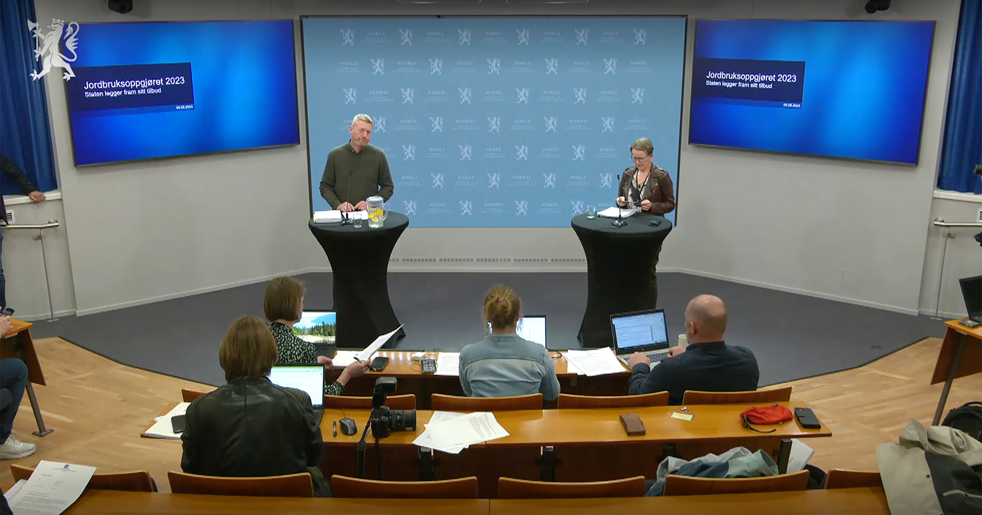 Avstand: Trass i at staten, her ved statens forhandlingsleiar Viil Søyland, tilbyr mindre enn det bøndene meiner dei treng, gjekk Bondelaget, her ved leiar Bjørn Gimming, med på forhandlingar. – Det må kome ein synleg gevinst. Det er kritisk no, seier Arthur Salte (under), styremedlem i Norges Bondelag. Foto: Skjermdump fra regjeringen.no