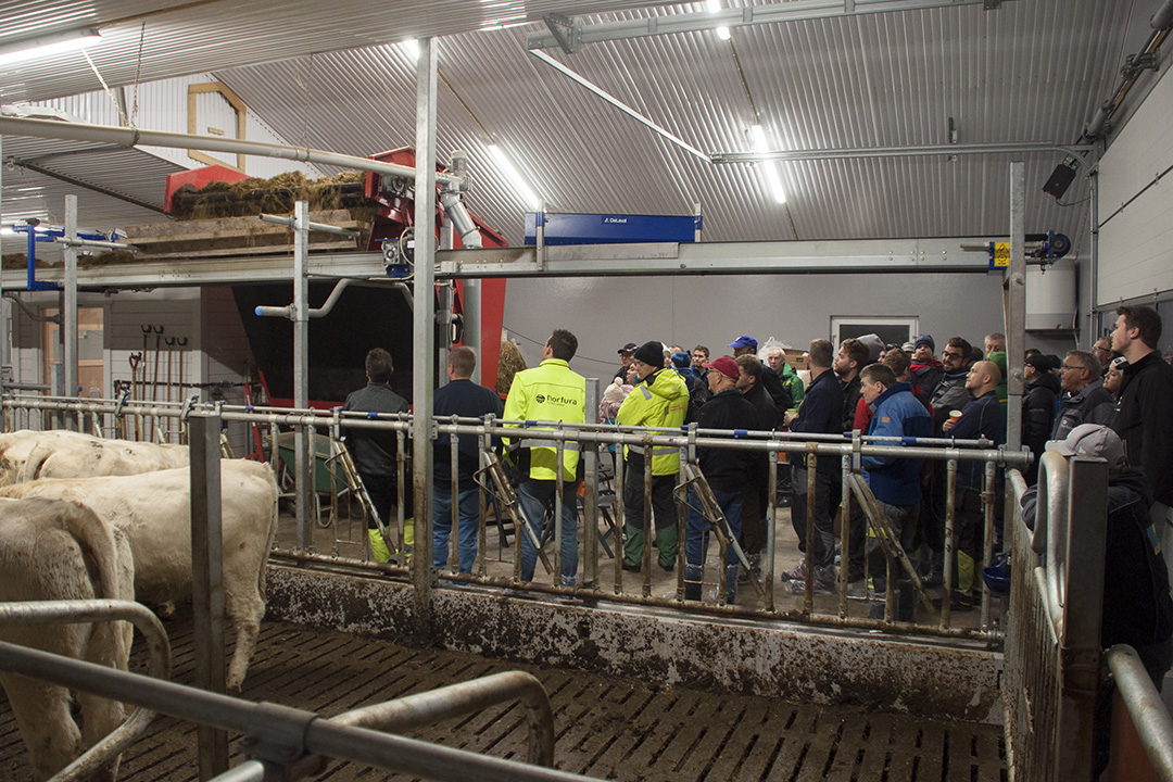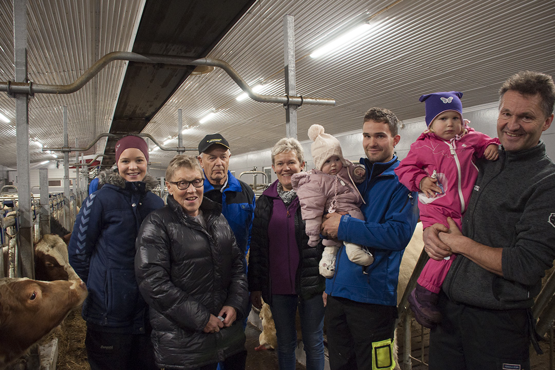 Naboar og andre skodelystne vrimlar rundt ham. «Alle» vil helse på, gratulere, og skryte til bonden. Kring 100 besøkande var innom på fjøsåpninga.