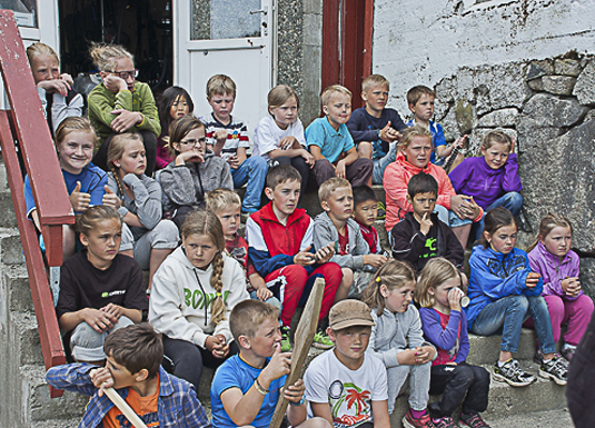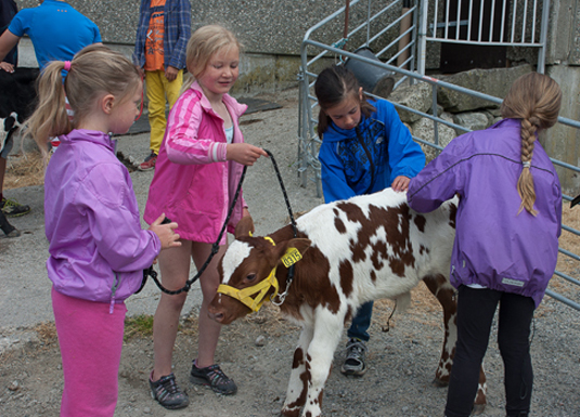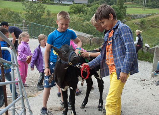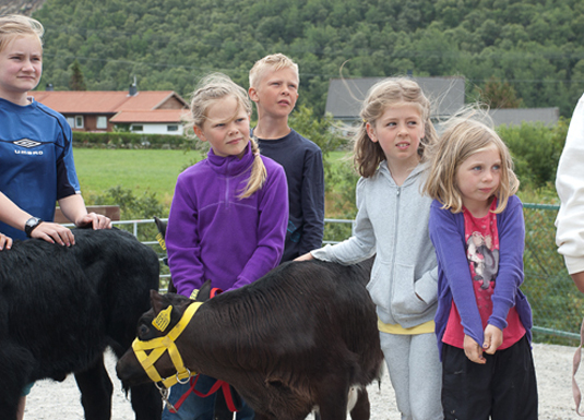 Topp konsentrasjon blant barna når Kristin viser og forklarer korleis ein førebur og mønstrar kalv.