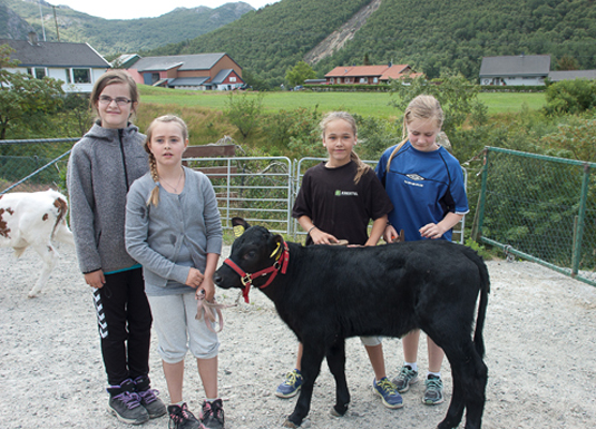 Jentene frå indre Gjesdal har stilt opp kalven heilt etter instruksjonen. Beina mot dommaren skal stå lengst frå kvarandre.