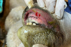 Sau med symptomer på blåtunge og blødning og skum fra munn. Bildet er tatt av sau på en bondegård i Agder i september 2024. Foto: Annette Hegermann Kampen.