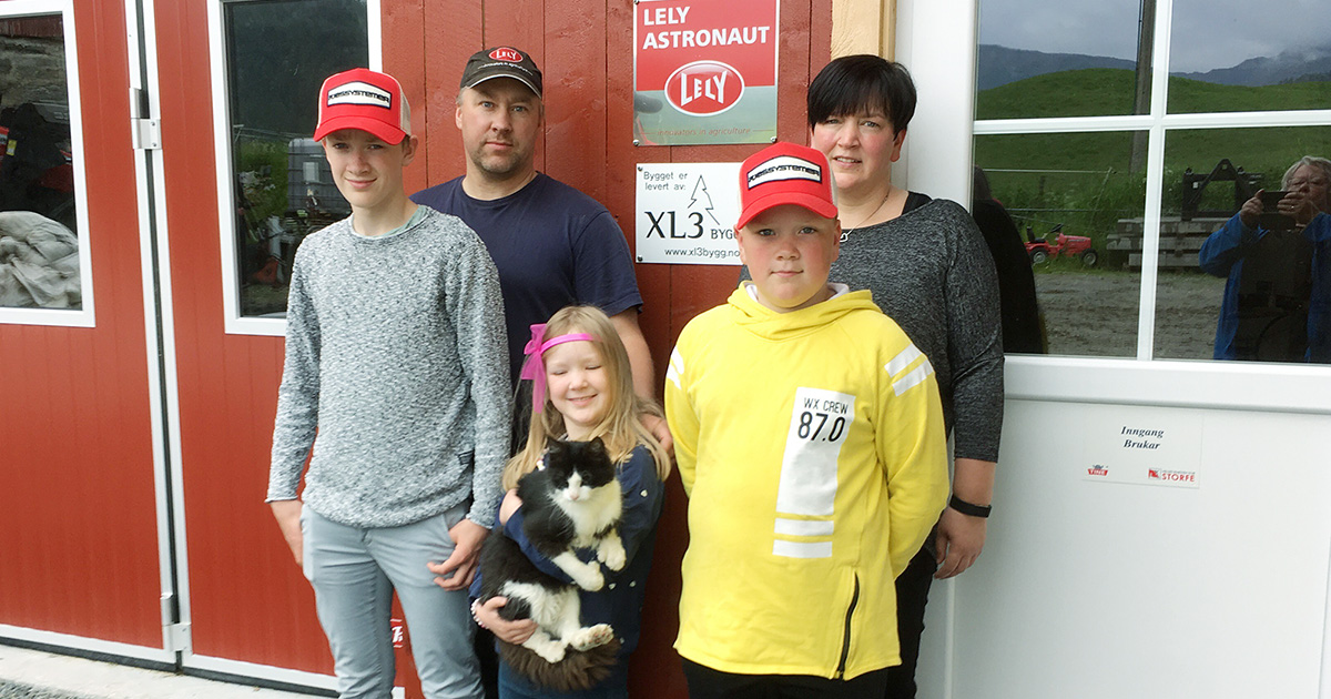Familieprosjekt: Daniel, Bertel Oddne, Kari og katten, Lars Rune og Linda er godt nøgd med den nye kvardagen i fjøset. Ikkje minst fordi dei alle kan bidra i arbeidet. Foto: Privat