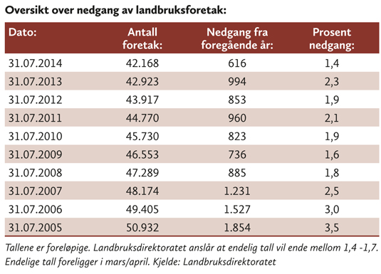 – Færre bønder slutter. Vel 42.000 foretak søkte om produksjonstilskudd ved søknadsomgangen i august 2014, viser foreløpige tall. Det er om lag 600 færre enn i fjor, som tilsvarer en nedgang på 1,4 prosent. Dette er den minste nedgangen på mange år. (Se tabell)