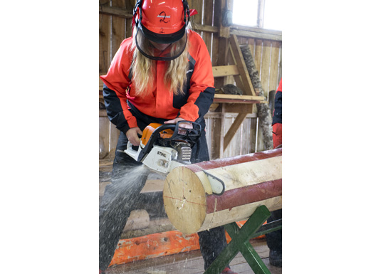 Presisjon vert målt i millimeter, og hurtighet vert målt i sekund. Ho startar saga og viser kva ho meiner med under og overkapp. Saga går og flisa fyk, medan hennar to lagkameratar ser på med kritiske blikk.