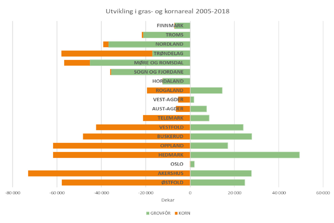 «I perioden fra 2005 til 2018 gikk kornarealet tilbake med 453 966 daa. I samme periode økte grasarealet med snaut 30 000 daa. Dette tyder på at tapet av kornarealer på landsbasis ikke erstattes av gras.