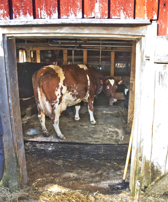 Torhild opnar den låge fjøsdøra og kua Frida kikkar ut. Her har mang ein veterinær og arbeidskar stanga hovudet i taket.