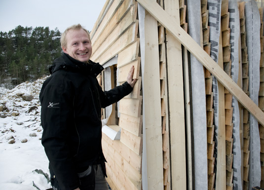Langs veggen på reiskapshuset står ferdigsnekra element. Det er tømmermannen på garden som har æra for dei. Treet er henta frå eigen skog, og skåren på eiga sag. Det nye fjøset skal byggast i ubehandla tre. Då er det ekstra viktig med god kvalitet på råvarene.