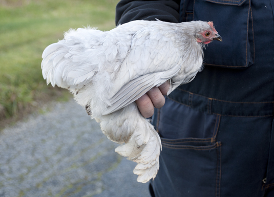 Dverghønene til Stokka har forskjellige fargar på fjæra, og den lysaste av dei, den perlegrå, legg egga med den lysaste nyansen av brunt.