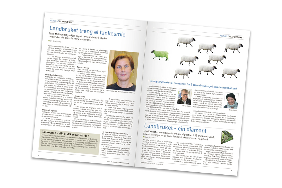 I BV 7 etterlyste mjølkeprodusent Torill Midtkandal ei tankesmie for landbruket. Professor og rektor ved HLB, Dag Jørund Lønning, støttar Midtkandal sine tankar om at landbruket, som samfunnet elles, vert stadig meir sektorisert og at det trengst nytenking.
