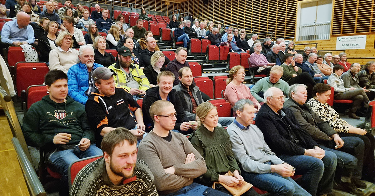 Topp stemning: Om lag 160 bønder frå heile Agder koste seg i hallen på Konsmo sist fredag.