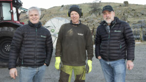 Økologisk: Nils Ove Nordland driv økologisk og har brukt slangespreiar dei sju siste sesongane. Nå har han investert i eige utstyr saman med naboen. Her er Nordland flankert av Kyrre Vasstveit t.v. og Geir Hauso frå Agromiljø.