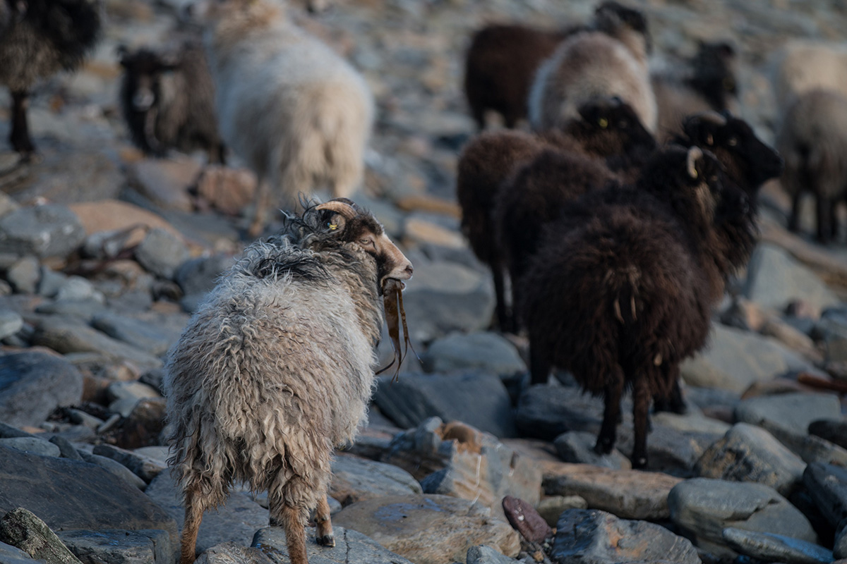 Frå september til mars går alle sauene på tangbeite i fjæra. Tang er best om vinteren, det passar godt til driftsopplegget.