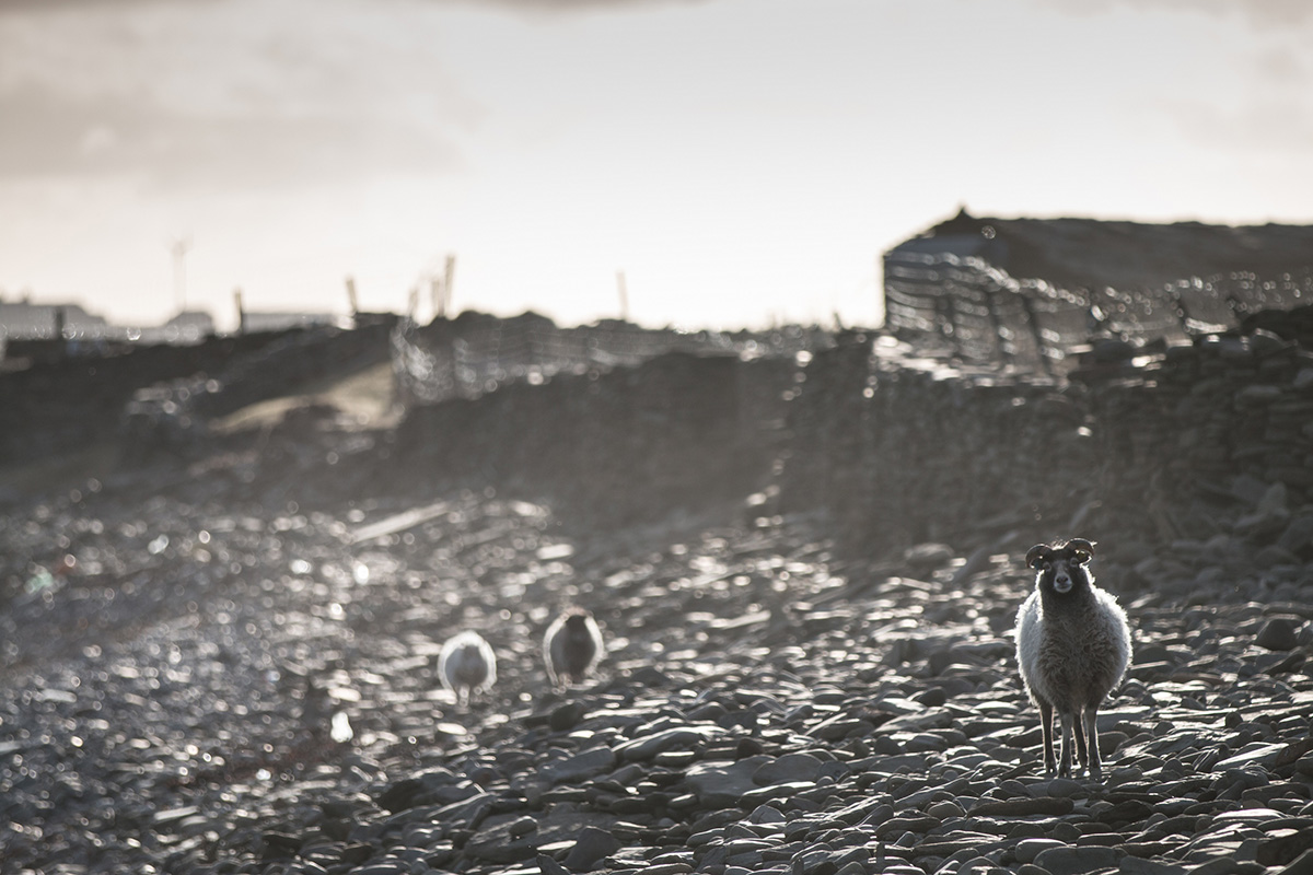 Unikt sauehald: Lite areal på øya gjorde at bøndene i si tid bygde eit steingjerde (dike) rundt heile øya og flytte saueflokkane ut i fjæra. No har dei lært seg å overleve på tang og det havet byr på. Foto: Orkney.com/Colin Keldie.