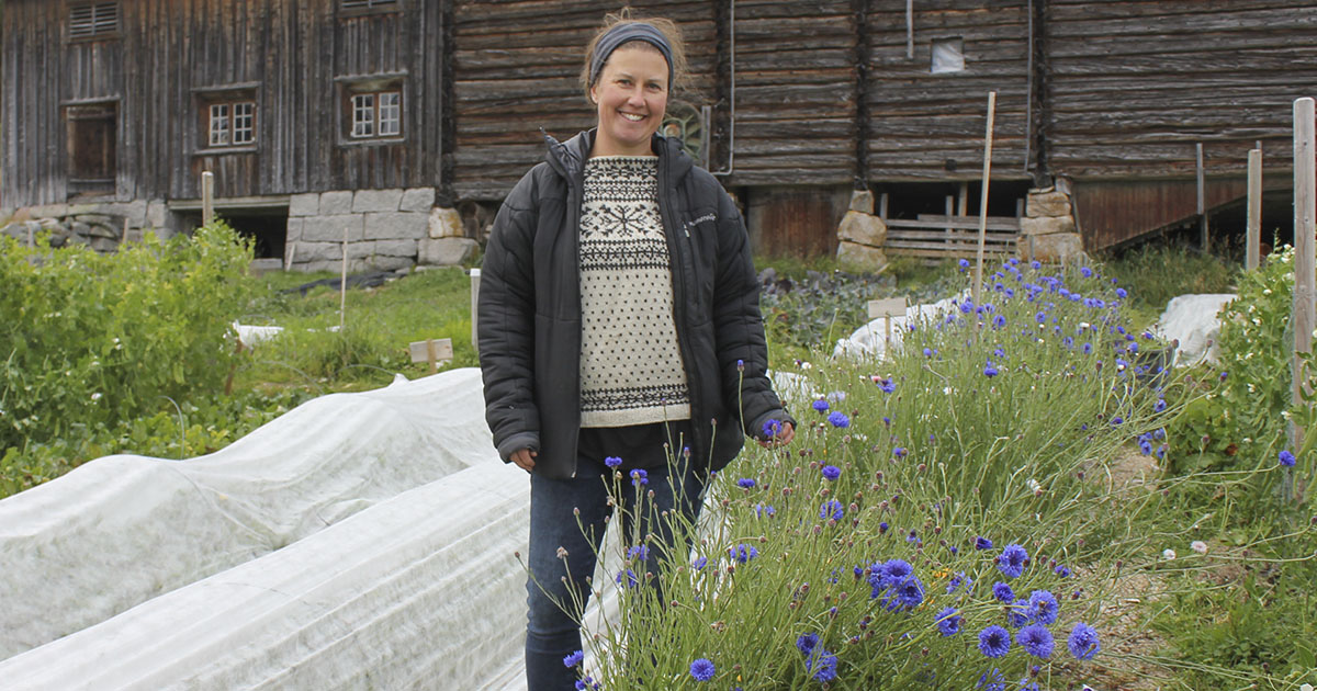 Dyrker grønsaker 775 meter over havet: Det gir fullstendig meining å dyrke grønsaker også her, seier Kristina Huitfeldt Carlsen. No vil ho prøve ut ulike sortar for å finne ut kva som trivst her, høgt over havet. – Eg er så heldig at eg bur her og kan ha maten min rundt meg, seier ho. Foto: Tone Lundeberg.