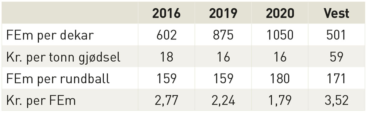 Mål for grovfôrdyrkinga: 2016 og 2019 er faktiske tal. Vest er faktiske gjennomsnittstal frå deltakarane i Vest i 2016. 2020 er mål Espeland har sett seg i samband med Grovfôr 2020.