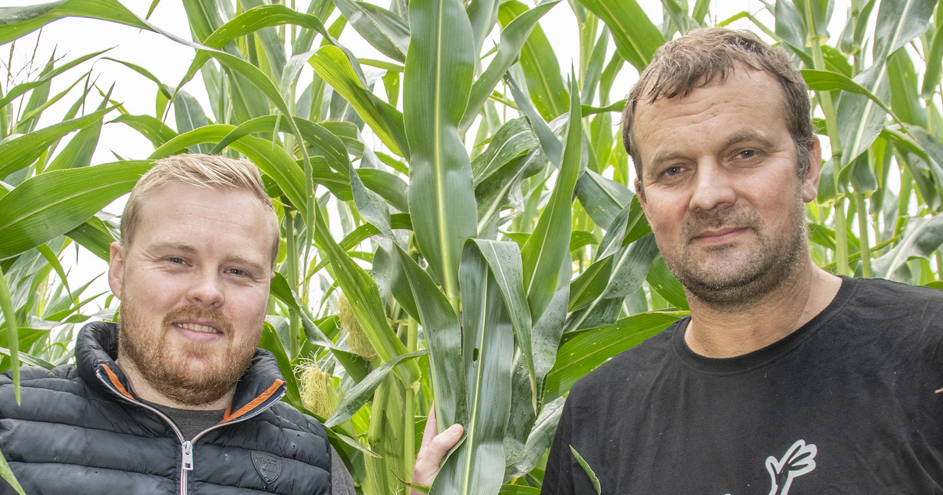 Maisjungel: Odd Ingebret Paulsen frå NLR t.v. saman med maisdyrkar Trond Joa. Åkeren på 70 mål er hausteklar i september/oktober.